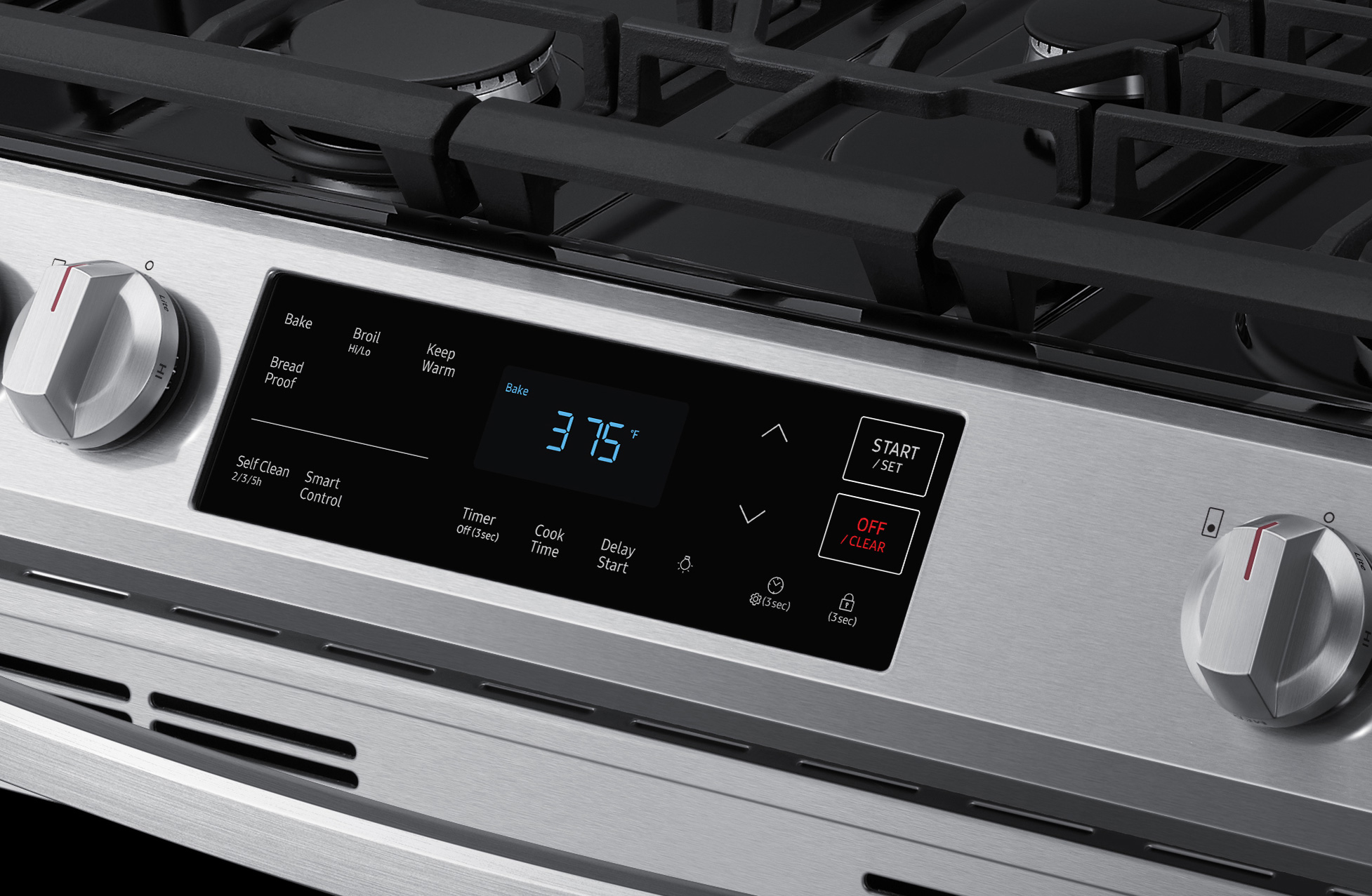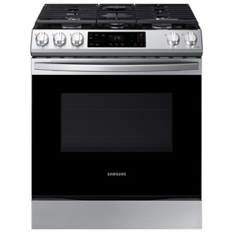 The range has control knobs for the cooktop and a control panel above the oven door.
