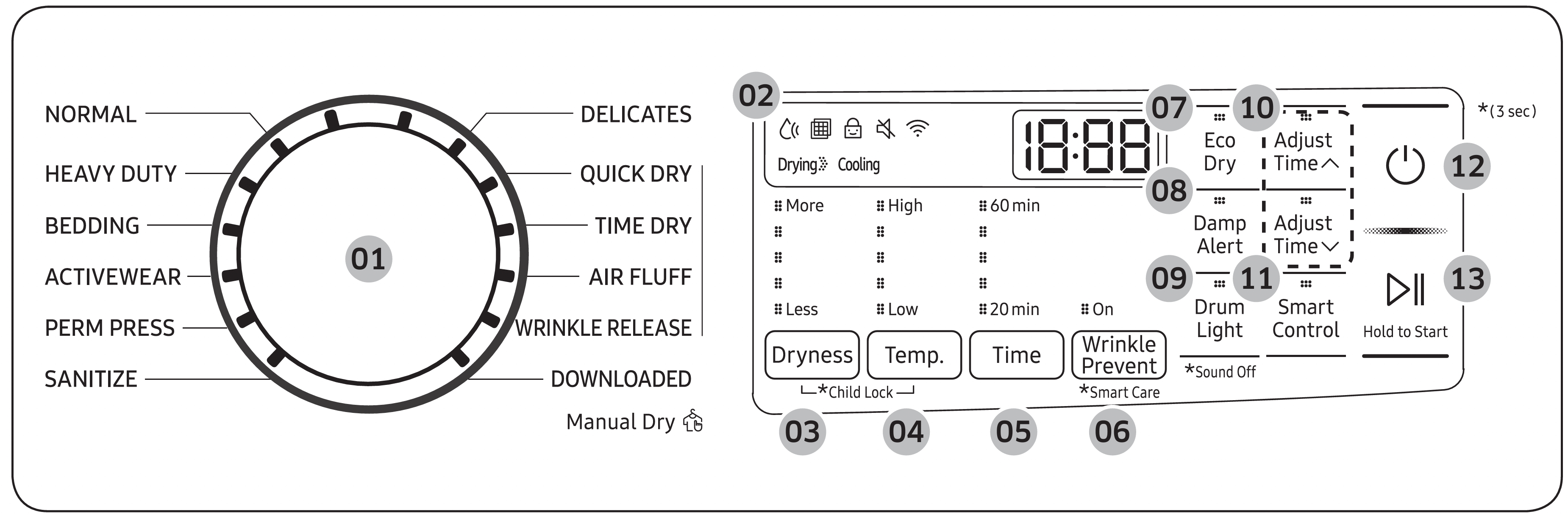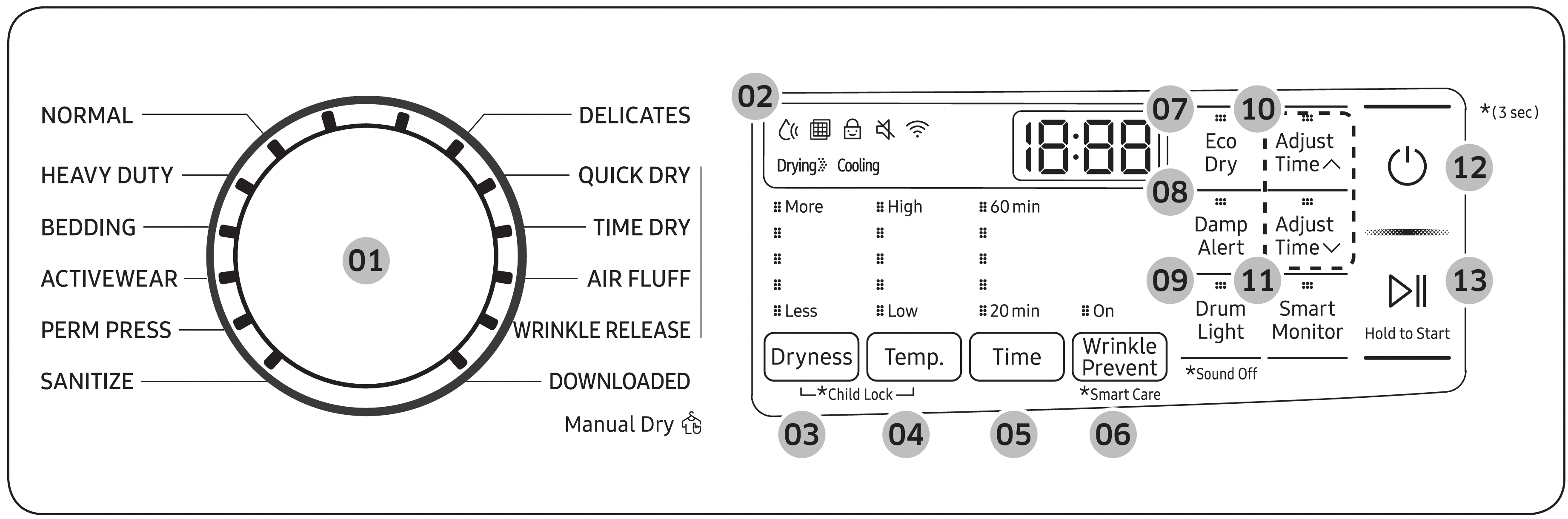 - Press the Power button to turn the dryer on, then simultaneously press and hold the Adjust Time and Dryness buttons for 3 seconds. “InS” appears in the dryer’s display. (If you have started other procedures before the Vent Blockage Test, the dryer will not enter the Vent Blockage Test mode.)