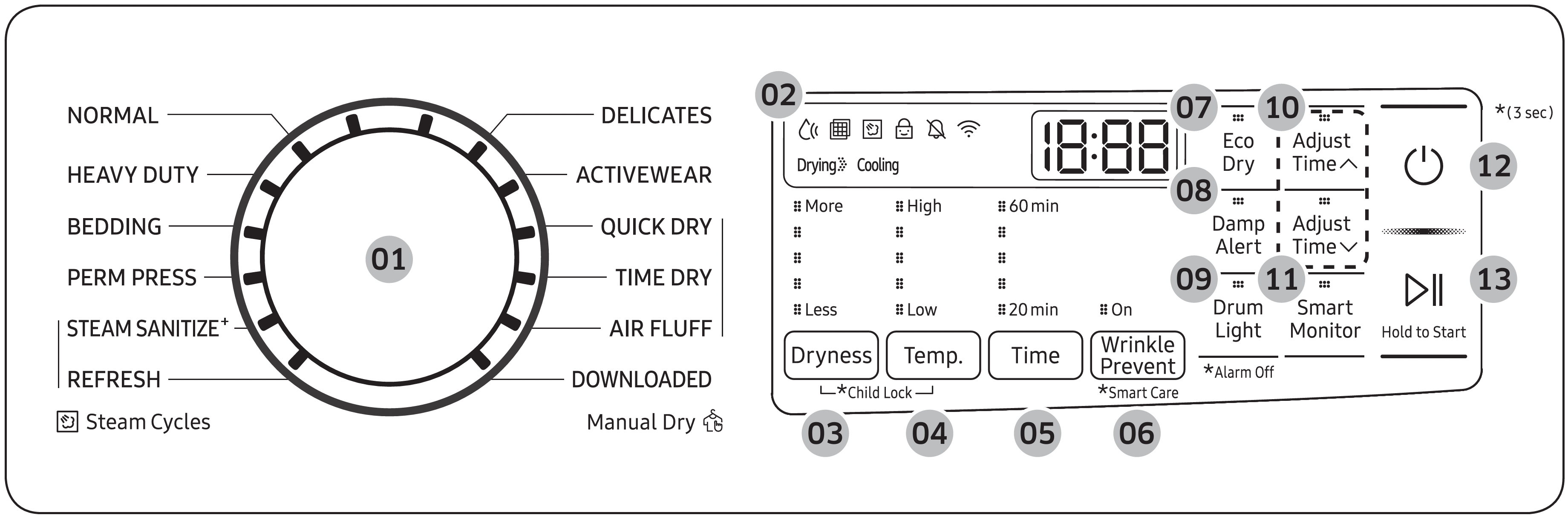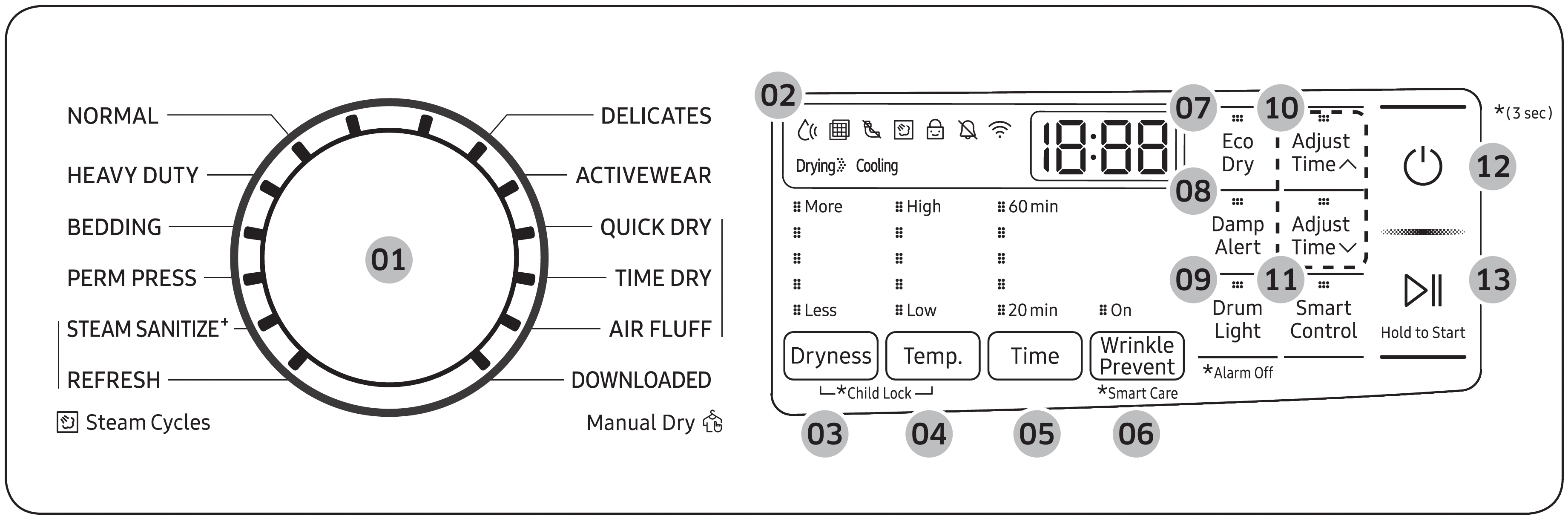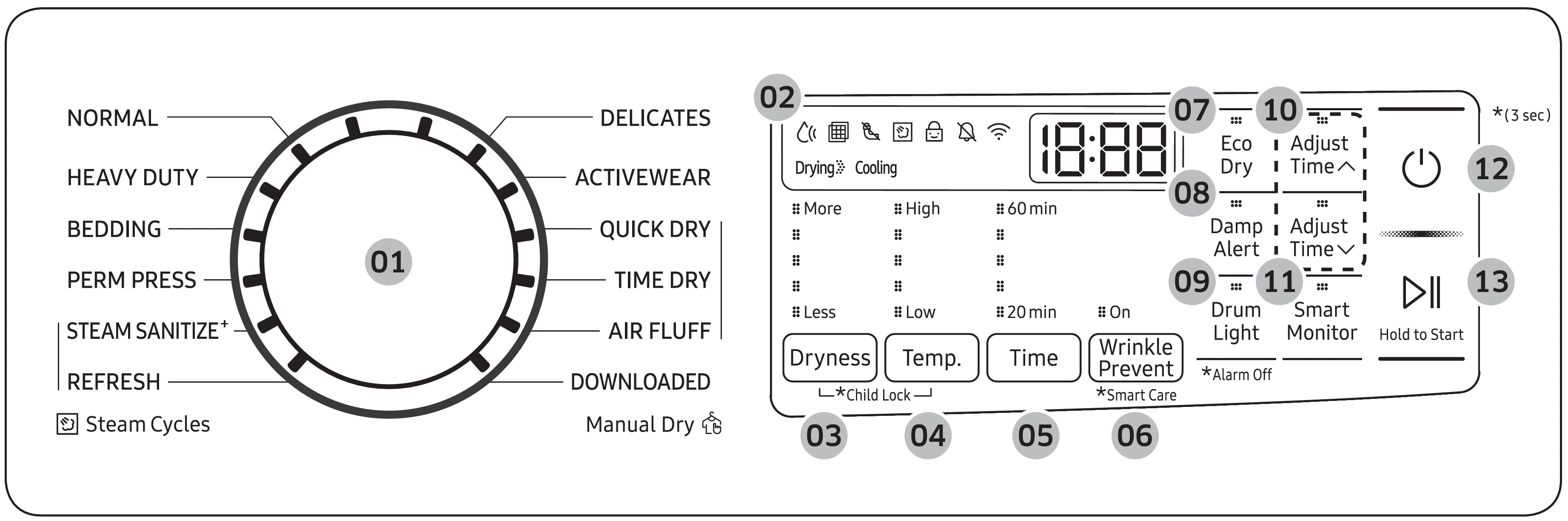 - Press the Power button to turn the dryer on, then simultaneously press and hold the Adjust Time and Dryness buttons for 3 seconds. “InS” appears in the dryer’s display. (If you have started other procedures before the Vent Blockage Test, the dryer will not enter the Vent Blockage Test mode.)