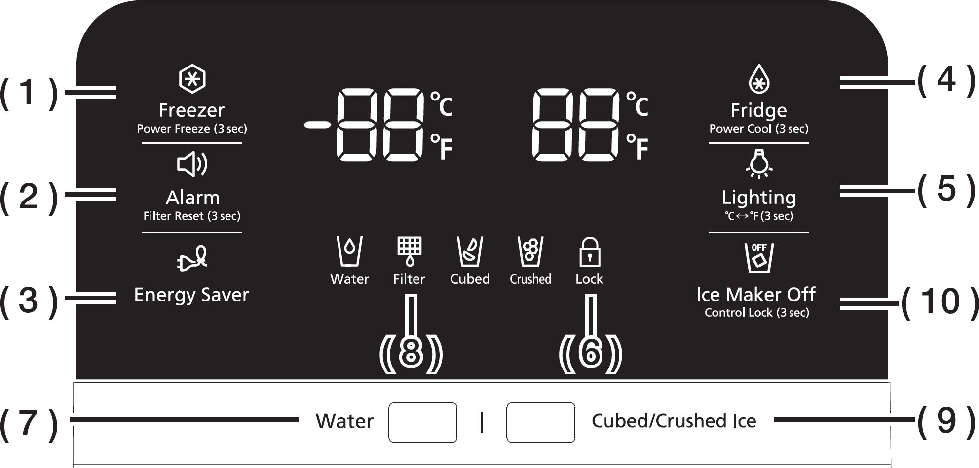 - To start Cooling Off mode, touch and hold the Freezer, Fridge and Alarm buttons for 5 seconds during normal operation. The refrigerator chime sounds and the temperature display flashes OFF.