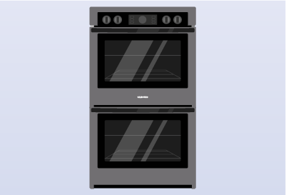 The control panel for this model is a touch screen with the knobs on the left side used for the upper oven and the knobs on the right side used for the lower oven. Certain menus and controls are shown and configured on the touch screen in the middle of the display.
