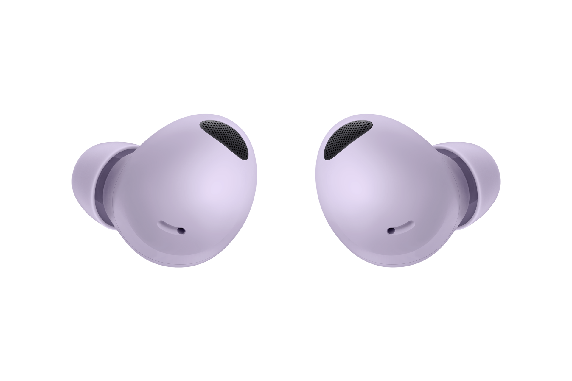 Dos auriculares Galaxy Buds2 Pro en Púrpura bora flotan en el medio de la pantalla.