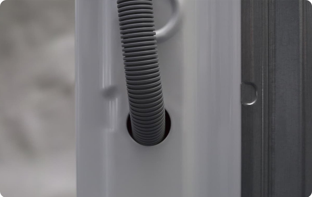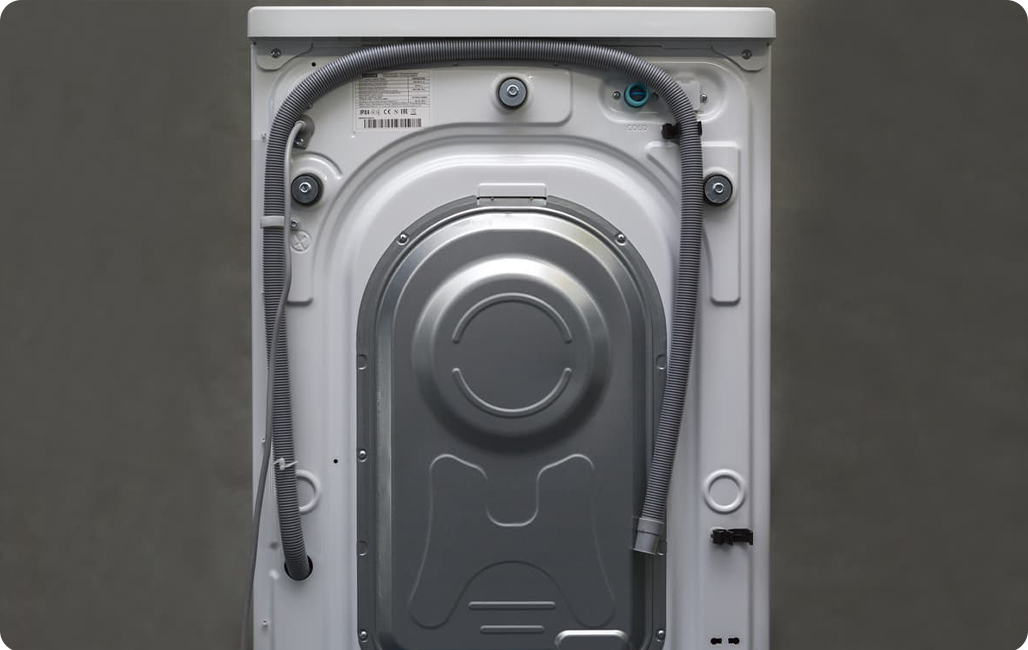 Начало сливного шланга закреплено внутри стиральной машины.