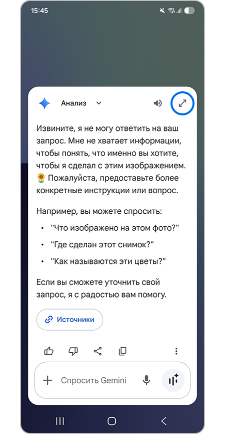 - Gemini поддерживается на телефонах Galaxy с AndroidTM 10 или выше. Бесшовная работа между приложениями с Gemini доступна только на телефонах Galaxy с Android 15 и One UI 7.0 или выше.