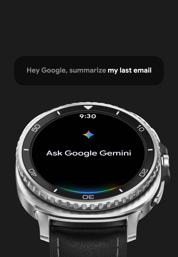 Galaxy Watch8 Classic слегка наклонены. Текстовое поле, указывающее на функцию голосового управления в Google Gemini. Привет, Google, подведи итоги моего последнего электронного письма. Циферблат часов изменился на Google Gemini. Вверху указано время, посередине — текст "Спросить Google Gemini".