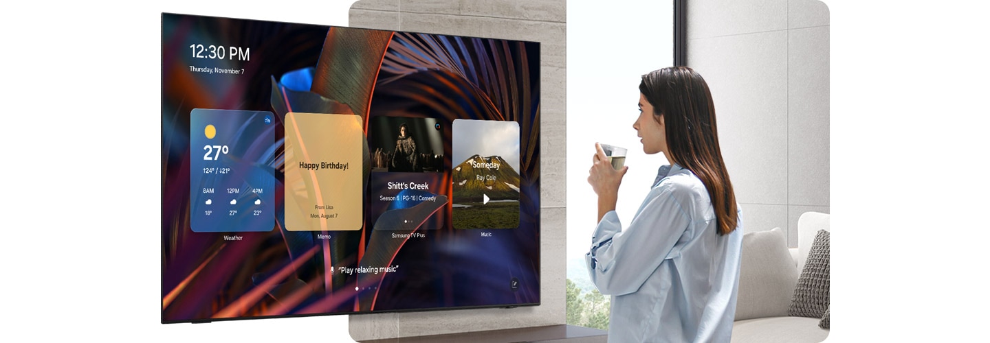 Televizoringizda kun davomida foydali vidjetlar namoyish etiladi. Ekran o‘chiq bo‘lsa ham, televizor foydalanuvchilarning yaqinlashayotganini aniqlashi va Kunlik boshqaruv panelini ko‘rsatishni yoqishi mumkin 10. Uni ob-havo, xotiralar, musiqa va boshqa vidjetlar yordamida sozlashingiz mumkin. Kunlik boshqaruv paneli ovozli buyruq yordamida ham faollashtirilishi mumkin.
