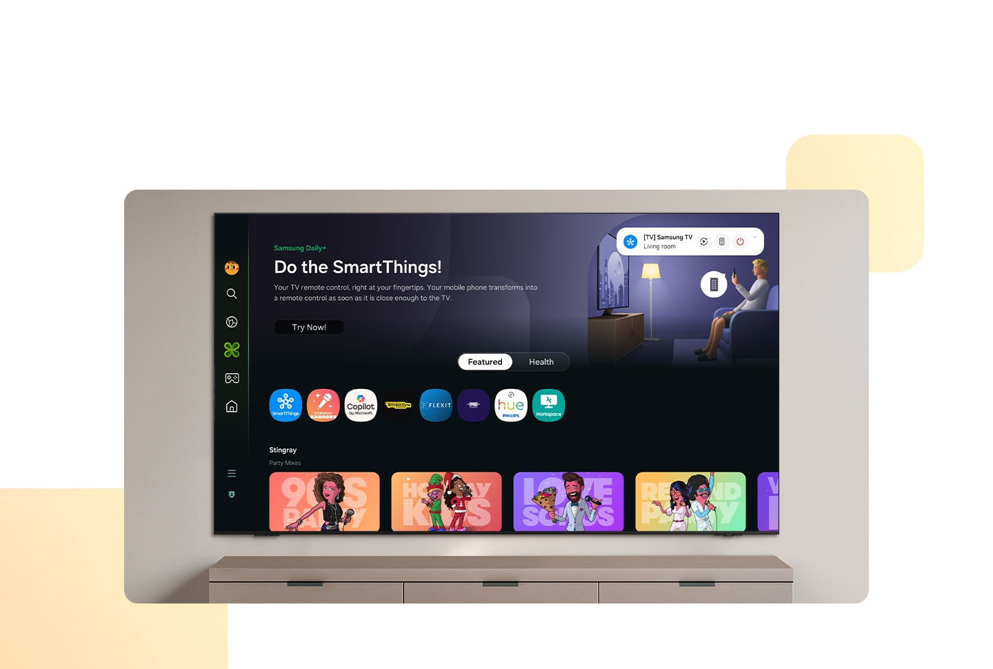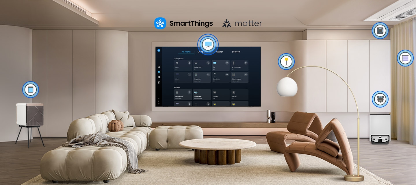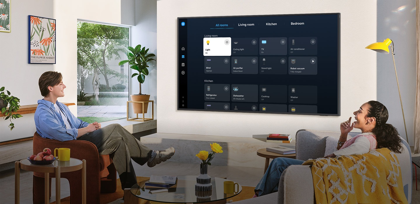 SmartThings 1 o‘rnatilgan xab tufayli televizorga aqlli qurilmalarni ulash va boshqarish mumkin - hatto Matter va HCA bilan mosligi talab qilinadigan qurilmalar ham. Shuningdek, smart uyingiz haqidagi axborotni bevosita ekrandan, jumladan, real vaqt rejimidagi xulosalar va optimallashtirish takliflarini olishingiz mumkin. 2