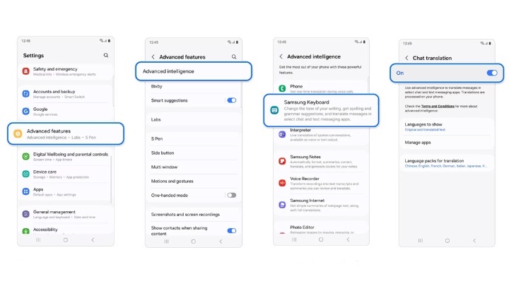 - Tính năng dịch trong Trợ lý Chat thông minh (Chat Assist) yêu cầu kết nối mạng internet, cần đang nhập Tài khoản Samsung và tải về các gói ngôn ngữ từ Galaxy Store. Cần đáp ứng độ dài của đoạn văn bản để kích hoạt tính năng. Độ khả dụng của tính năng tùy thuộc vào quốc gia, khu vực và ngôn ngữ. Một số ứng dụng trò chuyện có thể không hỗ trợ tính năng này. Độ chính xác của kết quả có thể không được đảm bảo hoàn toàn.