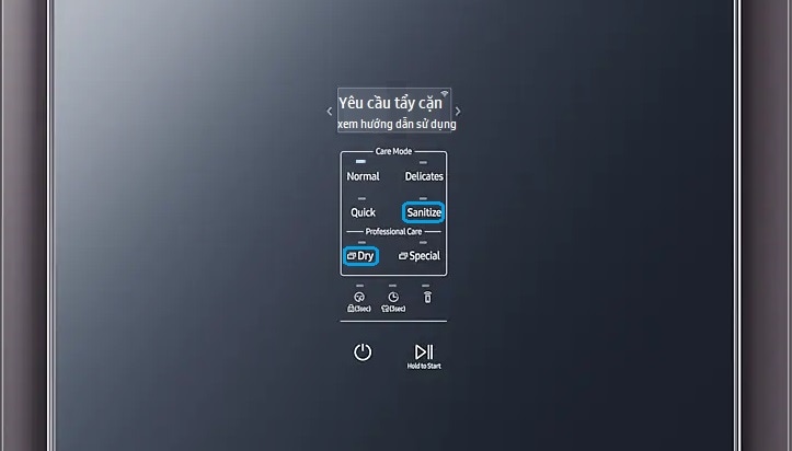 2. Nhấn và giữ Sanitize (Diệt khuẩn) và Dry (Sấy) cùng lúc trong 3 giây
