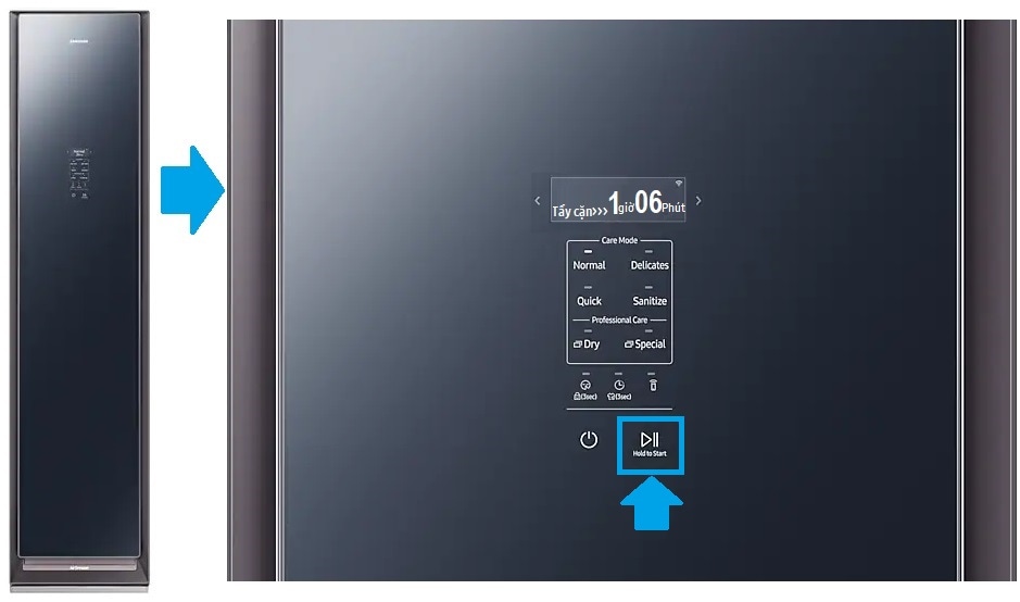 + Khi thông báo Hoàn tất quá trình Cấp / Xả nước xuất hiện trên màn hình, nhấn và giữ Bắt đầu/ Tạm dừng để máy hoạt động tiếp.