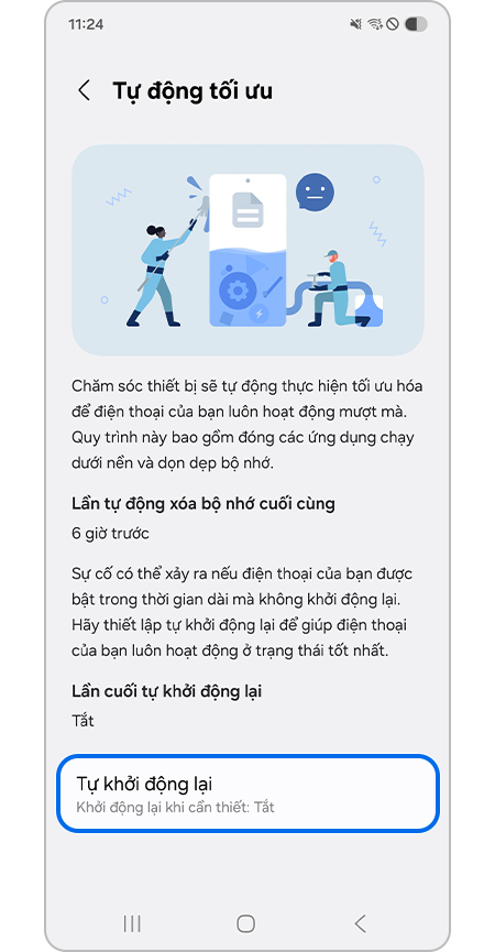 - Nếu bạn không khởi động lại điện thoại trong thời gian dài, có thể xảy ra các sự cố. Để duy trì hiệu suất tối ưu, bạn nên bật tính năng Tự khởi động lại.
