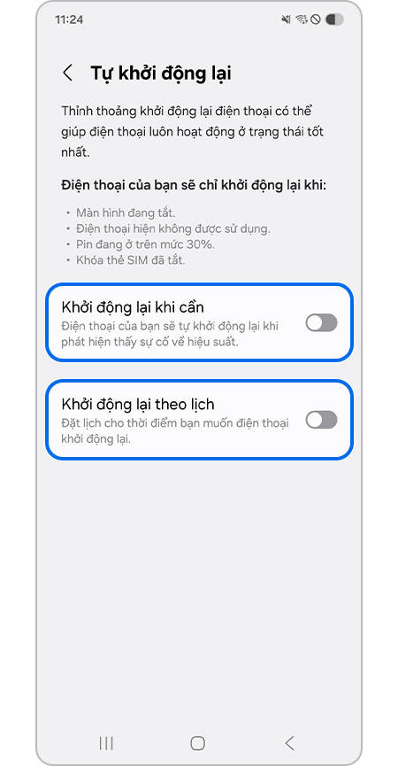 Lưu ý: Tính năng Tự khởi động lại chỉ hoạt động khi màn hình đang tắt, thiết bị hiện không được sử dụng, pin đang ở trên mức 30% và khóa thẻ SIM đã tắt.