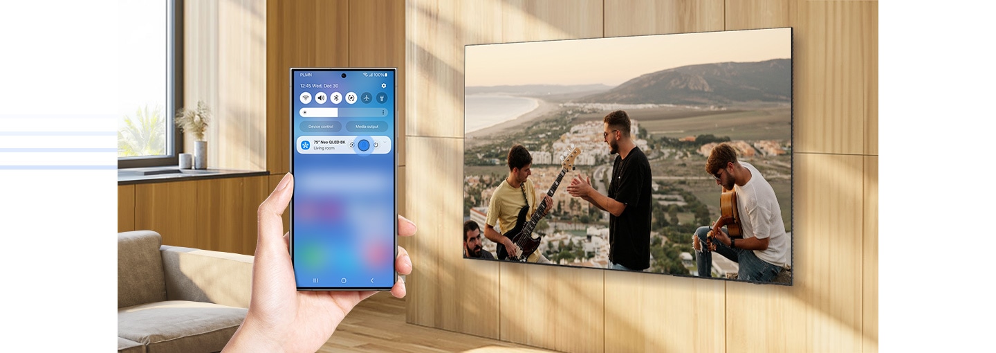Trải nghiệm hứng khởi ngập tràn trên màn hình cực rộng nhờ tính năng Mirroring2. Dù bạn đang chăm chú xem phim hay đắm mình vào chương trình truyền hình yêu thích, chỉ cần thao tác phóng chiếu từ điện thoại lên màn hình Smart TV Samsung. Ngả lưng, thư giãn và cứ thể tận hưởng nội dung trên màn hình lớn hơn nhiều lần nhờ tính năng Smart View hoặc AirPlay.