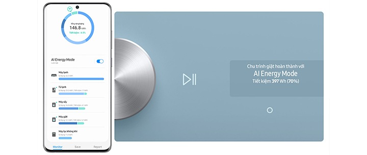 (3) Tiết kiệm 70% điện với chế độ AI Energy dựa trên thử nghiệm nội bộ trên máy WW11BB944AGB, điều kiện bình thường. Kết quả: Điện năng tiêu thụ không sử dụng chế độ AI Energy = 0,539 KWh. Điện năng tiêu thụ sử dụng chế độ AI Energy = 0,145 KWh.