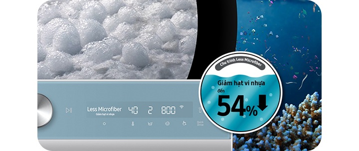 Giúp bảo vệ môi trường nhờ ngăn chặn hạt vi nhựa từ quần áo thải ra đại dương. Bằng cách tối ưu hóa tốc độ quay của động cơ và cường độ giặt, chu trình Less Microfiber giúp giảm đến 54%(4) lượng vi hạt nhựa thải ra trong quá trình giặt.